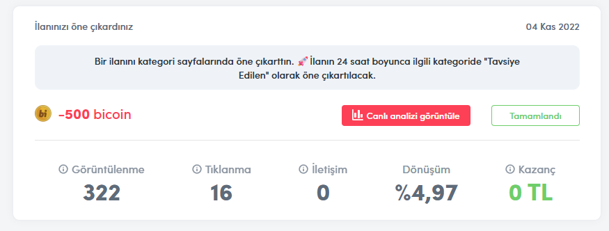Bicoin ile ilanınızı üst sıralara çıkarabilir ve daha fazla kullanıcıya gösterebilirsiniz.