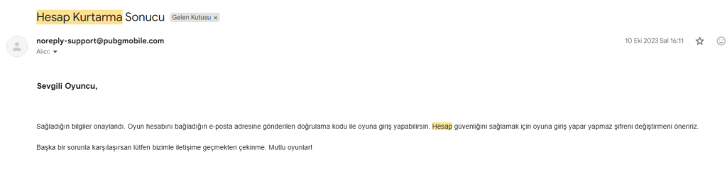 Hesabınızı hâlâ geri alamadıysanız, PUBG Mobile oyun içi destek ekibi ile iletişime geçin: